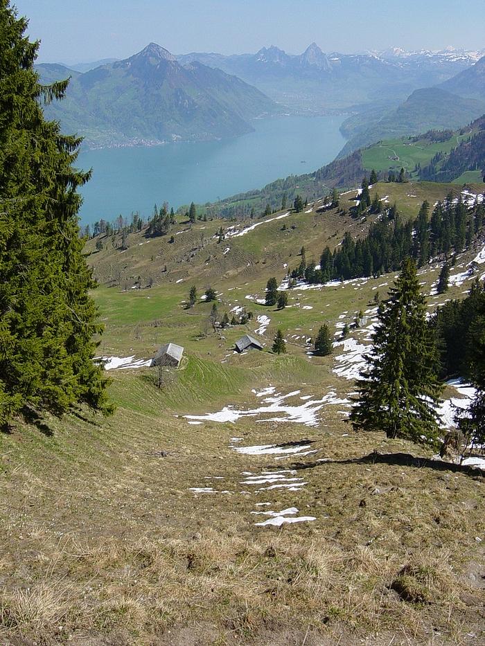 Das Tal, das von Bleiki nach Beckenried führt. Hintergrund Gersauerstock und die beiden Mythen