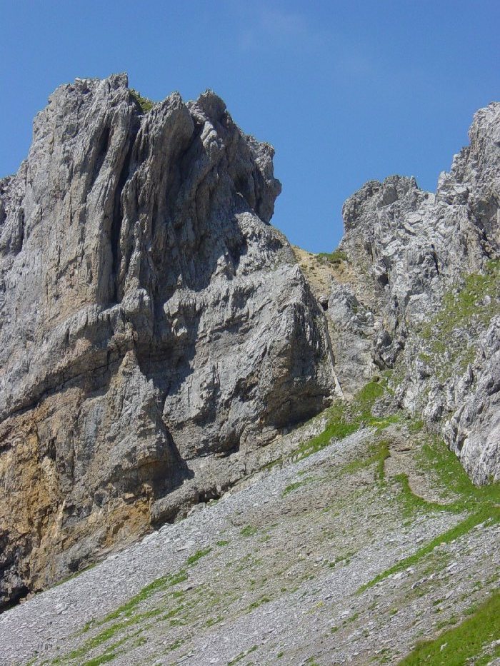 Zu dieser imposanten Lücke steigen wir auf. Oben beim Sattel geht es ein paar Meter hinunter.