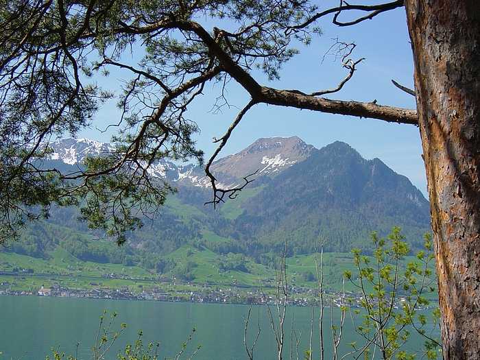 Zwischen Gersau und Weggis zahllose wunderbare Ausblicke! Föhren umramhen das Bild, Buochserhorn!