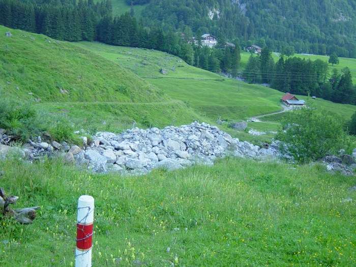 Diese bemalten Holzpflöcke führen uns zur Wolfisalp, Blick zurück zum Parkplatz auf Stöckalp