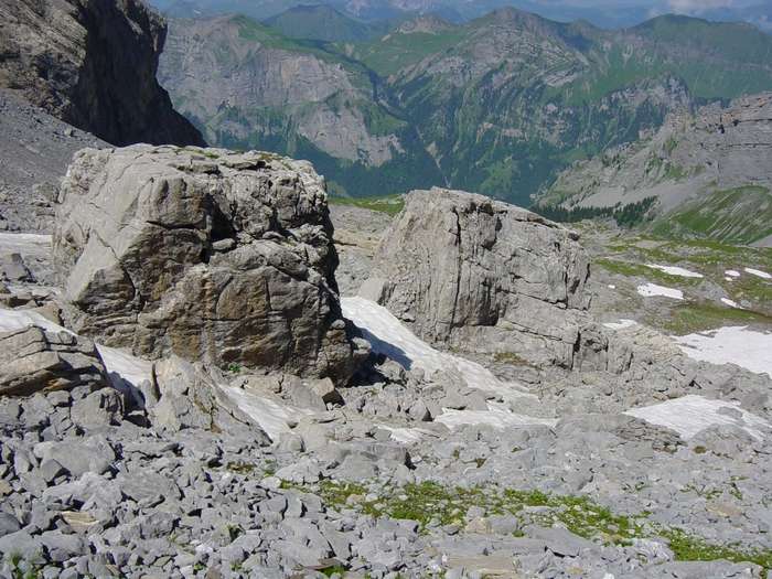 2 Markante "Wegweiser", Tourenskifahrer sollten links von diesen markigen Felsblöcken hinunterfahren, um nicht eine Felswand hinunter zu fliegen.