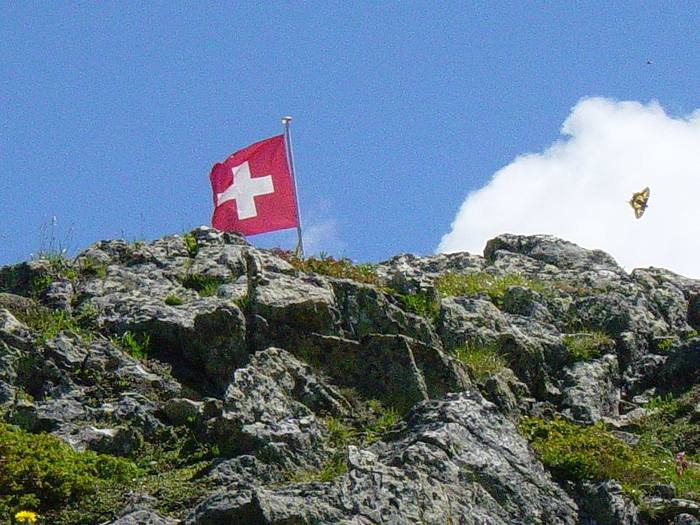 2 Schnappschüsse in einem: Das wohlbekannte Schweizerkreuz und rechts ein schöner Schmetterling in vollem Fluge!