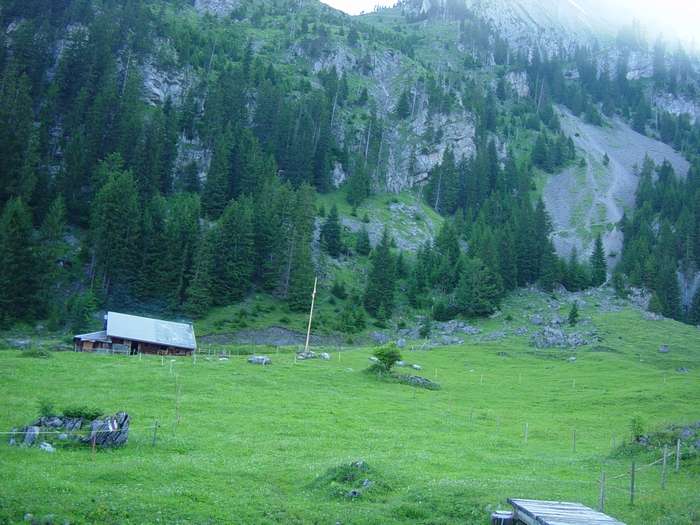 Die Alp Unterboden liegt noch schön im Schatten, rechts sieht man den Weg zur Wolfisalp hinauf!